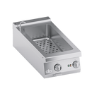 Cadru din otel inoxidabil. Butoane din plastic termorezistent atermic cu margini imprimate serigrafic utile. Incalzire realizata prin elemente de incalzire cu folie gravata: caldura este transferata doar la fundul bazinului pentru economie de energie. Termostat de siguranta cu reactivare manuala. Functionare prin comutator ON-OFF si termostat 30°C-90°C cu sonda imersata in bazin. Blat de lucru din AISI 304 turnat cu grosime de 2 mm cu colturi rotunjite pentru curatare usoara. Panouri frontale, laterale si posterioare din otel inoxidabil. Bazin turnat la rece din AISI 304 cu orificiu de scurgere, potrivit pentru recipiente de pana la 150 mm inaltime. Posibilitatea de a sustine mai multe recipiente pana la 1/1 + 1/3 GN. Robinet de umplere cu apa pe panoul frontal. Manere din AISI 304 cu sectiune transversala eliptica. Scurgere bazin pe panoul frontal actionata prin parghie. Finisaj blat de lucru taiat cu laser pentru potrivire cap la cap si fixare prin prindere. Accesorii disponibile la cerere. SPECIFICATII TEHNICE Latime: 400 mm Adancime: 900 mm Inaltime: 265 mm Greutate: 29 kg Volum: 0.26 m³ Putere electrica: 1.50 kW