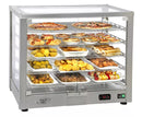 Vitrina incalzita cu ventilatie model cu 3 rafturi si putere 1.8 kw asigura mentinerea temperaturii constante pentru produsele alimentare expuse. Sistemul de ventilatie integrat garanteaza distributia uniforma a aerului cald pe toate cele 3 rafturi de prezentare.