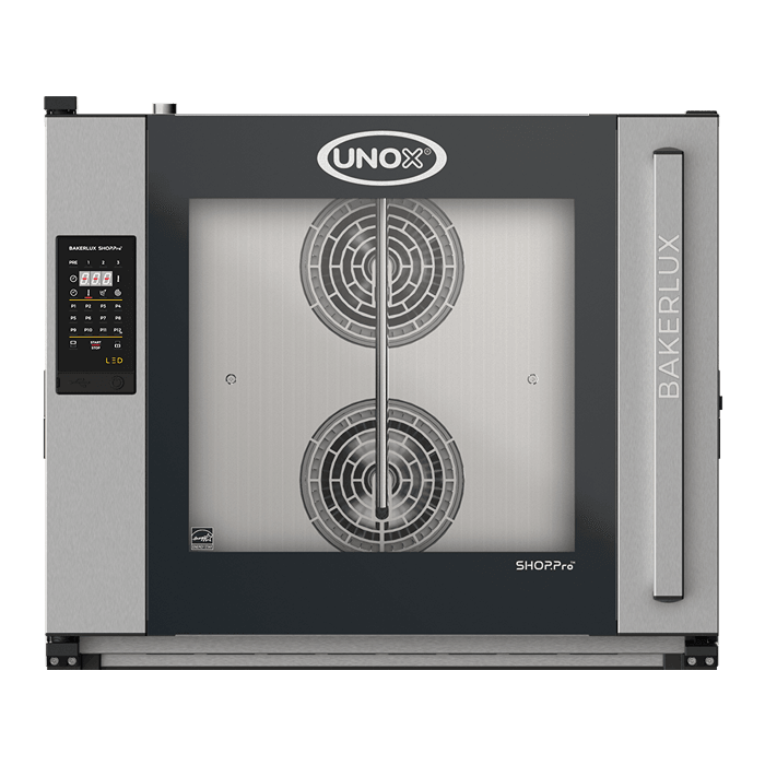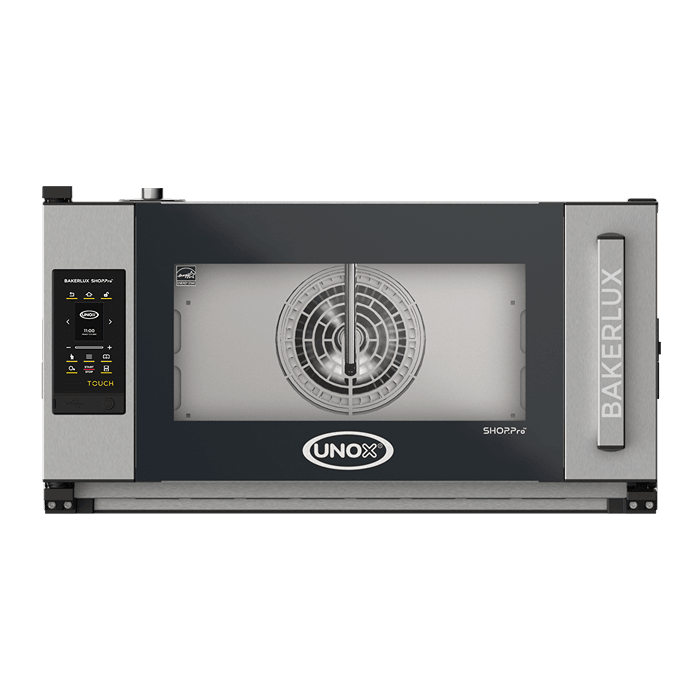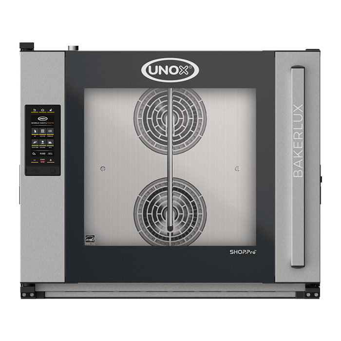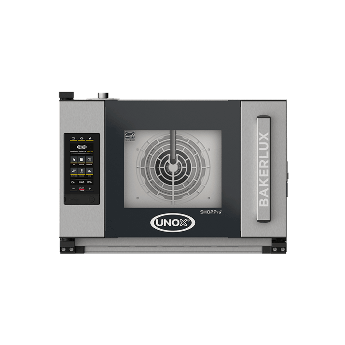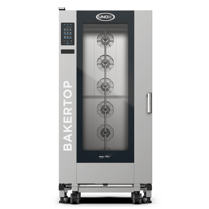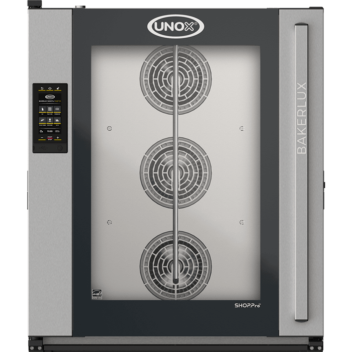 Cuptor combinat electric, echipat cu 6 tăvi de dimensiune 600x400 mm și ușă cu balama pe partea stângă. Panou de control tactil de 9,5".