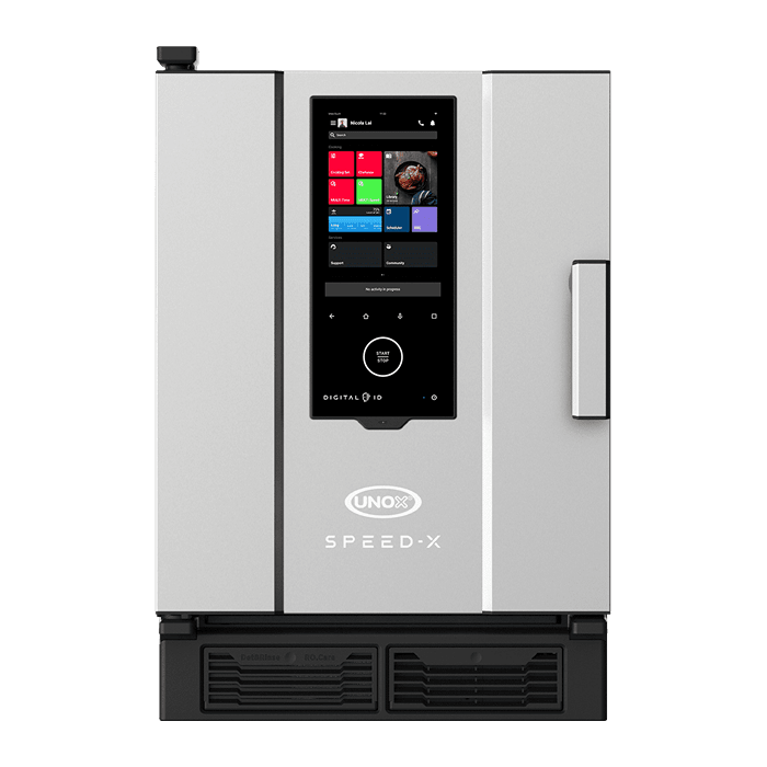 Cuptor combinat electric, echipat cu 6 tăvi de dimensiune 600x400 mm și ușă cu balama pe partea stângă. Panou de control tactil de 9,5".