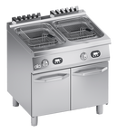 Cadru din otel inoxidabil. Butoane din plastic rezistente la temperaturi ridicate, cu gradatii.. Usa cu pereti dubli si maner robust. Incalzire cu ulei obtinuta prin elemente de incalzire din otel inoxidabil, scufundate in ulei si usor basculante pentru operatiuni simple de curatare. Doua bazine de 15 litri prevazute cu placa electronica cu termocuplu clasa J, care permite reglarea temperaturii intre 100°C si 190°C. Termostat de siguranta cu reactivare manuala. Ciclul de topire a grasimii asigura controlul electronic intermitent programat al incalzirii uleiului atat in timpul incalzirii cat si in timpul mentinerii la cald prin impulsuri pana la 100°, pentru a evita supraincalzirea uleiului si a aparatului. Utilizarea ciclului de topire asigura temperaturile corecte ale uleiului si previne stresul termic periculos. Bazin din otel inoxidabil cu margini rotunjite in panta spre gura de scurgere conectata la un recipient de ulei din otel inoxidabil. Suprafata de lucru si bazin turnate pentru curatare usoara. Panouri frontale, laterale si posterioare din otel inoxidabil. Echipat standard cu recipient de ulei din otel inoxidabil cu filtru. Echipat standard cu doua cosuri din otel inoxidabil K26237 si doua capace pentru bazin ATA-K7COPFGP. Finisaj blat taiat cu laser pentru potrivire etansa si fixare prin legare. Picioare reglabile pe inaltime din otel inoxidabil. Accesorii disponibile la cerere.