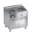 Cadru din otel inoxidabil. Butoane din plastic rezistente la temperaturi ridicate, cu gradatii.. Usa cu pereti dubli si maner robust. Incalzire cu ulei obtinuta prin elemente de incalzire din otel inoxidabil, scufundate in ulei si usor basculante pentru operatiuni simple de curatare. Doua bazine de 15 lt. prevazute cu termostat, care permite reglarea temperaturii intre 100°C si 190°C. Termostat de siguranta cu reactivare manuala. Bazine din otel inoxidabil cu margini rotunjite in panta spre orificiul de scurgere conectat la un recipient de ulei din otel inoxidabil. Suprafata de lucru si bazin mulat pentru curatare usoara. Panouri frontale, laterale si posterioare din otel inoxidabil. Echipat standard cu recipient de ulei din otel inoxidabil cu filtru. Echipat standard cu doua cosuri din otel inoxidabil K26237 si doua capace pentru bazin ATA-K7COPFGP. Finisaj blat taiat cu laser pentru potrivire etansa si fixare prin legare. Picioare reglabile pe inaltime din otel inoxidabil. Accesorii disponibile la cerere.