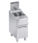 Cadru din otel inoxidabil. Butoane din plastic rezistente la temperaturi ridicate, cu gradatii.. Incalzirea uleiului realizata prin arzatoare din otel inoxidabil cu combustie optimizata, echipate cu schimbator de caldura in rezervor. Interventie puternica si rapida a elementelor de incalzire pentru a preveni scaderea temperaturii cand produsul este turnat in rezervor. Doua rezervoare de cate 7 litri fiecare, echipate cu supapa termostatica mecanica cu 8 pozitii corespunzand la 8 niveluri de temperatura de la 120°C la 190°C. Siguranta garantata de un termocuplu mentinut activ de flacara arzatorului pilot. Termostat de siguranta suplimentar. Rezervoare din otel inoxidabil cu margini rotunjite inclinate spre orificiul de scurgere conectat la un recipient din otel inoxidabil pentru colectarea uleiului. Uleiul se scurge din rezervor printr-un robinet intr-un recipient de colectare intern cu filtru. Livrat standard cu doua cosuri din otel acoperite cu un strat de material protector K26537 si un capac pentru bazin din otel inoxidabil ATA-K7COPFG7. Livrat standard cu un recipient pentru ulei din otel inoxidabil cu filtru. Blat din otel inoxidabil AISI 304 turnat pentru curatare usoara. Panou frontal din otel inoxidabil AISI 304. Rezervoare din otel inoxidabil formate la rece. Finisaj blat taiat cu laser pentru potrivire etansa si fixare prin legare. Testat cu gaz natural sau GPL, in functie de necesitatile utilizatorului. Picioare reglabile pe inaltime din otel inoxidabil. Accesorii disponibile la cerere.