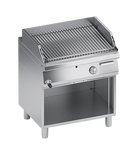 Cadru din otel inoxidabil. Butoane din plastic rezistente la temperaturi ridicate, cu gradatii.. Incalzire obtinuta prin arzator cu flacara stabilizata cu cinci ramificatii. Echipat cu robinet de gaz de siguranta care permite reglarea puterii de la maxim la minim. Siguranta asigurata prin termocuplu mentinut activ de flacara arzatorului pilot. Echipat standard cu gratar mobil din otel inoxidabil pentru carne. Gratar suport pentru alimente care poate fi pozitionat la doua niveluri diferite, chiar si in timpul functionarii. Suprafata inclinata spre orificiul de scurgere a grasimii, conectata la un recipient de mare capacitate sub suprafata de gatit. Echipat standard cu doua sertare mici pentru colectarea prafului din piatra de lava arsa. Echipat standard cu un sac de lava de 5 kg. Blat turnat din otel inoxidabil AISI 304 cu margini rotunjite pentru curatare usoara. Finisaj blat taiat cu laser pentru potrivire etansa si fixare prin legare. Testat cu gaz natural sau GPL, in functie de necesitatile utilizatorului. Picioare din otel inoxidabil reglabile pe inaltime. Accesorii disponibile la cerere. SPECIFICATII TEHNICE Latime: 800 mm Adancime: 700 mm Inaltime: 850 mm Volum: 18.00 m³