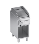 Cadru din otel inoxidabil. Butoane din plastic rezistente la temperaturi ridicate, cu gradatii.. Incalzire obtinuta prin arzator cu flacara stabilizata cu doua ramuri. Echipat cu robinet de gaz de siguranta care permite reglarea puterii de la maxim la minim. Siguranta asigurata de un termocuplu mentinut activ de flacara arzatorului pilot. Echipat standard cu gratar mobil din otel inoxidabil pentru carne. Gratar suport pentru alimente care poate fi pozitionat la doua niveluri diferite, chiar si in timpul functionarii. Suprafata inclinata spre orificiul de scurgere a grasimii, conectata la un recipient de mare capacitate sub suprafata de gatit. Echipat standard cu un sertar mic pentru colectarea prafului din piatra de lava arsa. Echipat standard cu un sac de lava de 5 kg. Blat turnat din otel inoxidabil AISI 304 cu margini rotunjite pentru curatare usoara. Finisaj blat taiat cu laser pentru potrivire etansa si fixare prin legare. Testat cu gaz natural sau GPL, in functie de necesitatile utilizatorului. Picioare reglabile pe inaltime din otel inoxidabil. Accesorii disponibile la cerere.