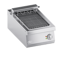 Cadru din otel inoxidabil. Butoane din plastic rezistente la temperaturi ridicate, cu gradatii. Incalzirea se obtine prin elemente de incalzire cu teaca AISI 304, care functioneaza in aer si sunt potrivite pentru temperaturile la care sunt expuse (400°C). Sarcina termica a elementelor de incalzire permite schimbul de caldura doar catre alimente pentru a imbunatati gatitul si economia de energie. Termostat de siguranta cu resetare automata pentru protectia elementelor de incalzire. Regulator de energie care ajusteaza frecventa functionarii ON-OFF a elementelor de incalzire. Pozitia de functionare continua maxima este utila in procesul de curatare, deoarece induce piroliza grasimilor pe elementele de incalzire. Rezervor de apa detasabil AISI 304 presat la rece cu orificiu de scurgere. Apa imbunatateste calitatea alimentelor gatite si transporta grasimile de gatit la scurgere. Blat de lucru din otel inoxidabil AISI 304 cu recipient Gastronorm 1/1 GN detasabil cu margini rotunjite pentru curatare usoara. Panouri frontale, laterale si posterioare din otel inoxidabil. Finisaj blat de lucru taiat cu laser pentru potrivire "cap la cap" si fixare prin legare. Accesorii disponibile la cerere.