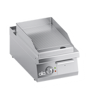 Cadru din otel inoxidabil. Butoane din plastic rezistente la temperaturi ridicate, cu gradatii.. Incalzire obtinuta prin elemente tubulare de incalzire cu teaca din otel inoxidabil plasate in contact direct cu placa de gatit. Reglarea temperaturii prin termostat. Temperaturi de lucru intre 90°C si 300°C. Termostat de siguranta cu resetare manuala impotriva functionarii defectuoase. Placa de gatit mare, groasa, cu finisaj neted care permite o transmisie excelenta a caldurii. Protectie anti-stropire sudata. Geometria santurilor placilor de gatit striate permite curatarea cu racleta neteda folosita pentru taiere. Placa de gatit este instalata pe blat cu o usoara inclinare pentru a permite scurgerea grasimii. Placa de gatit striata. Blat din otel inoxidabil AISI 304 cu colturi rotunjite pentru curatare usoara. Panouri frontale, laterale si posterioare din otel inoxidabil. Orificiu mare pe suprafata de gatit pentru scurgerea grasimilor intr-un recipient de mare capacitate plasat sub suprafata de gatit. Echipat standard cu recipient de colectare a grasimii. Dop din teflon, potrivit pentru astuparea scurgerii in cazul gatirii cu pelicula de ulei, disponibil la cerere. Finisaj blat taiat cu laser pentru potrivire cap la cap si fixare prin legare. Accesorii disponibile la cerere.