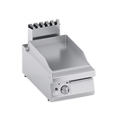 Cadru din otel inoxidabil. Butoane din plastic termorezistent atermic. Crestere rapida a temperaturii si retentie termica obtinuta prin arzator cu flacara stabilizata de inalta performanta, potrivit pentru lucru la temperaturi ridicate. Aprindere prin scanteie electrica la 230V monofazat cu nul. Suprafata de gatit groasa, cu colturi rotunjite si protectie anti-stropire sudata pentru curatare usoara. Placa de gatit usor inclinata spre scurgerea grasimii, conectata la un recipient sub blatul de lucru. Echipat standard cu recipient colector de grasime. Placa de gatit neteda. Prevazut cu robinet de gaz cu termostat de siguranta, care permite reglarea puterii pana la 300°C. Siguranta asigurata prin termocuplu mentinut activ de flacara arzatorului. Finisaj blat taiat cu laser pentru imbinare cap la cap si fixare. Testat cu gaz natural sau GPL, conform necesitatilor utilizatorului. Accesorii disponibile la cerere. SPECIFICATII TEHNICE Latime: 400 mm Adancime: 700 mm Inaltime: 265 mm Greutate: 29 kg Volum: 0.21 m³ Putere electrica: 0.10 kW