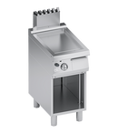 Cadru din otel inoxidabil. Butoane din plastic rezistente la temperaturi ridicate, cu gradatii.. Crestere rapida a temperaturii si retentie termica obtinuta prin arzatoare cu 2 ramificatii cu combustie optimizata, potrivite pentru lucrul la temperaturi inalte, cu supapa de siguranta cu termocuplu controlata termostatic in 8 pozitii si flacara pilot. Reglarea temperaturii intre 150°C si 315°C. Siguranta asigurata prin termocuplu mentinut activ de flacara arzatorului pilot. Placa de gatit unica de dimensiuni mari si profil redus, fabricata din otel inoxidabil special si prelucrata cu finisaj neted care permite transmiterea excelenta a caldurii si finisaj lucios tip oglinda pentru a asigura non-aderenta alimentelor si curatare rapida conform normelor in vigoare. Placa de gatit neteda. Blat inclinat spre orificiul de scurgere a grasimii. Orificiu mare pe suprafata de gatit pentru scurgerea grasimilor intr-un recipient furnizat cu capacitate de 1.3 litri sub suprafata de gatit. Blat turnat din otel inoxidabil AISI 304 cu margini rotunjite pentru curatare usoara. Panouri frontale, laterale si posterioare din otel inoxidabil. Dop din teflon, potrivit pentru astuparea scurgerii in cazul gatirii cu pelicula de ulei, disponibil la cerere. Finisaj blat taiat cu laser pentru potrivire etansa si fixare prin prindere. Testat cu gaz natural sau GPL, conform necesitatilor utilizatorului. Picioare reglabile pe inaltime din otel inoxidabil. Accesorii disponibile la cerere.