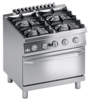 Cadru din otel inoxidabil. Usa cuptorului cu pereti dubli si maner pentru utilizare intensa. Butoane din plastic termorezistent atermic. Incalzire obtinuta prin arzatoare cu coroana suprapusa etanse, cu flacara stabilizata si puteri diferite (8,5 kw). Fiecare arzator este prevazut cu robinet de siguranta pentru gaz, care permite reglarea puterii de la maxim la minim. Siguranta asigurata prin termocuplu mentinut activ de flacara arzatorului pilot. Gratare si arzatoare realizate din fonta emailata mata RAAF rezistenta la alcali, acizi si foc. Gratare asezate pe suprafete turnate cu margini rotunjite pentru curatare usoara si evitarea scurgerii lichidelor. Tavi din otel inoxidabil cu margini rotunjite, amplasate sub arzatoare pentru curatare usoara. Cuptor pe gaz GN 2/1. Gratar detasabil din otel inoxidabil pentru cuptor. Baza cuptorului realizata din tabla groasa de otel, ranforsata cu nervuri. Izolarea camerei de gatit si a usii cuptorului asigurata printr-un strat de fibra ceramica rezistenta la temperaturi inalte. Crestere rapida a temperaturii si retentie termica obtinute prin arzator cu flacara stabilizata cu difuzor integrat de inalta performanta, adecvat pentru functionare la temperaturi ridicate. Arzatorul cuptorului este echipat cu robinet termostatic pentru gaz care permite reglarea temperaturii pana la 300°C. Siguranta asigurata prin termocuplu mentinut activ de flacara arzatorului. Finisaj blat de lucru taiat cu laser pentru imbinare "cap la cap" si fixare prin prindere. Picioare reglabile pe inaltime din otel inoxidabil. Testat cu gaz natural sau GPL, in functie de necesitatile utilizatorului. Accesorii disponibile la cerere. SPECIFICATII TEHNICE Latime: 800 mm Adancime: 700 mm Inaltime: 850 mm Greutate: 101 kg Volum: 0.80 m³ Putere gaz: 41.50 kW