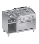 Cadru din otel inoxidabil. Usa cuptorului cu pereti dubli si maner pentru utilizare intensa. Butoane din plastic termorezistent atermic. Incalzire obtinuta prin arzatoare cu flacara stabilizata cu coroana simpla cu puteri diferite. Fiecare arzator este prevazut cu robinet de siguranta pentru gaz, care permite reglarea puterii de la maxim la minim. Siguranta asigurata prin termocuplu mentinut activ de flacara arzatorului. Gratare superioare din otel acoperit cu material protector si arzatoare caracterizate prin corp din otel inoxidabil si capace arzator din alama nichelata. Gratare superioare asezate pe suprafete turnate cu margini rotunjite si arzatoare etanse pentru curatare usoara. Cuptor electric cu convectie GN 1/1 si dulap deschis. Gratar cuptor detasabil din otel inoxidabil. Vatra cuptorului realizata din tabla groasa de otel, ranforsata cu o serie de nervuri. Izolarea camerei de gatit si a usii cuptorului asigurata printr-un strat de fibra ceramica rezistenta la temperaturi inalte. Incalzire obtinuta prin elemente speciale de incalzire din otel inoxidabil rezistente la temperaturi inalte, amplasate sub partea inferioara si deasupra camerei de gatit. Circulatia aerului garantata de un ventilator din otel inoxidabil actionat de un motor electric puternic. Posibilitatea de a selecta diferite tipuri de incalzire atat statica cat si ventilata, atat incalzire de jos cat si tip grill, sau incalzire completa. Echipat cu termostat care regleaza temperatura intre 90°C si 300°C. Termostat de siguranta cu resetare manuala impotriva supraincalzirii. Finisaj blat de lucru taiat cu laser pentru imbinare "cap la cap" si fixare prin prindere. Picioare reglabile pe inaltime din otel inoxidabil. Testat cu gaz natural sau GPL, in functie de necesitatile utilizatorului. Accesorii disponibile la cerere. SPECIFICATII TEHNICE Latime: 1200 mm Adancime: 700 mm Inaltime: 850 mm Greutate: 136 kg Volum: 1.15 m³ Putere electrica: 3.65 kW Putere gaz: 30.00 kW