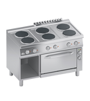 Cadru din otel inoxidabil. Butoane din plastic termorezistent cu margini serigrafiate utile. Usa dublu captusita a cuptorului si maner cu sectiune eliptica din AISI 304. Incalzire obtinuta prin plite electrice rotunde din fonta. Elemente de incalzire fixate pe partea inferioara a placii, incorporate intr-un strat de material izolant. Fiecare plita este prevazuta cu un selector care permite varierea puterii de incalzire de la maxim la minim in sapte pozitii. Siguranta asigurata de un limitator de temperatura situat in interiorul plitei. Suprafata de lucru turnata din AISI 304 cu desen inversat pentru asezarea perfecta a plitelor electrice, curatare usoara si evitarea deteriorarii componentelor electrice de catre lichide. Panou frontal din otel inoxidabil AISI 304. Cuptor electric cu convectie GN 1/1 si baza deschisa. Baza cuptorului realizata dintr-o foaie groasa de otel, ranforsata cu o serie de nervuri. Gratar detasabil din otel inoxidabil. Izolarea camerei de gatit si a usii cuptorului asigurata de un strat de fibra ceramica rezistenta la temperaturi inalte. Incalzire obtinuta prin elemente speciale de incalzire din otel inoxidabil rezistente la temperaturi inalte, amplasate sub partea inferioara si deasupra camerei de gatit. Circulatia aerului garantata de un ventilator din otel inoxidabil actionat de un motor electric puternic. Echipat cu termostat care regleaza temperatura intre 90°C si 300°C. Termostat de siguranta cu resetare manuala impotriva supraincalzirii. Posibilitatea de a selecta diferite tipuri de incalzire atat statica cat si ventilata, atat incalzire de jos cat si tip grill, sau incalzire completa. Finisaj blat de lucru taiat cu laser pentru potrivire "cap la cap" si fixare prin prindere. Picioare reglabile pe inaltime din otel inoxidabil. Accesorii disponibile la cerere. SPECIFICATII TEHNICE Latime: 1200 mm Adancime: 700 mm Inaltime: 850 mm Greutate: 133 kg Volum: 1.15 m³ Putere electrica: 19.25 kW
