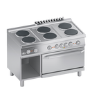 Cadru din otel inoxidabil. Butoane din plastic termorezistent cu margini serigrafiate utile. Usa dublu captusita a cuptorului si maner cu sectiune eliptica din AISI 304. Incalzire obtinuta prin plite electrice rotunde din fonta. Elemente de incalzire fixate pe partea inferioara a placii, incorporate intr-un strat de material izolant. Fiecare plita este prevazuta cu un selector care permite varierea puterii de incalzire de la maxim la minim in sapte pozitii. Siguranta asigurata de un limitator de temperatura situat in interiorul plitei. Suprafata de lucru din AISI 304 turnata cu desen inversat pentru asezarea perfecta a plitelor electrice, curatare usoara si evitarea deteriorarii componentelor electrice de catre lichide. Panou frontal din otel inoxidabil AISI 304. Cuptor electric static GN 2/1 potrivit pentru tavi GN 2/1 si baza deschisa. Camera de gatit din otel inoxidabil AISI 430 si podea groasa din otel inoxidabil. Gratar detasabil din otel inoxidabil. Izolarea camerei de gatit si a usii cuptorului asigurata de un strat de fibra ceramica rezistenta la temperaturi inalte. Incalzire obtinuta prin elemente de incalzire plasate sub partea inferioara si deasupra camerei de gatit. Echipat cu termostat care regleaza temperatura intre 90°C si 300°C. Posibilitatea de a selecta diferite tipuri de incalzire: doar de jos, doar de sus sau ambele prin intermediul unui selector. Finisaj blat de lucru taiat cu laser pentru potrivire cap la cap si fixare prin prindere. Picioare reglabile pe inaltime din otel inoxidabil. Accesorii disponibile la cerere. SPECIFICATII TEHNICE Latime: 1200 mm Adancime: 700 mm Inaltime: 850 mm Greutate: 135 kg Volum: 1.15 m³ Putere gaz: 21.00 kW