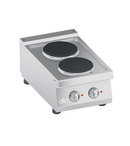 Cadru din otel inoxidabil. Butoane din plastic termorezistent atermic cu margini utile serigrafiate. Incalzire obtinuta prin plite electrice rotunde din fonta. Elemente de incalzire fixate pe partea inferioara a plitei, incorporate intr-un strat de material izolant. Fiecare plita este prevazuta cu un selector care permite varierea puterii de incalzire de la maxim la minim in sapte pozitii. Siguranta asigurata de un limitator de temperatura situat in interiorul plitei. Suprafata de lucru turnata din AISI 304 cu desen inversat pentru asezarea perfecta a plitelor electrice, curatare usoara si evitarea deteriorarii componentelor electrice de catre lichide. Panou frontal din otel inoxidabil AISI 304. Finisaj al blatului taiat cu laser pentru imbinare "cap la cap" si fixare cu bride. Accesorii disponibile la cerere. SPECIFICATII TEHNICE Latime: 400 mm Adancime: 700 mm Inaltime: 265 mm Greutate: 19 kg Volum: 0.21 m³ Putere electrica: 5.20 kW