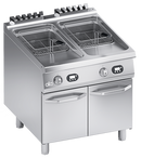 Cadru din otel inoxidabil. Butoane din plastic termorezistent cu margini serigrafiate utile. Usa cu pereti dubli si maner robust. Incalzirea uleiului obtinuta prin elemente de incalzire puternice din otel inoxidabil, scufundate in ulei si usor de inclinat pentru operatiuni simple de curatare. Elemente de incalzire puternice si cu activare rapida, pentru a evita racirea uleiului la introducerea alimentelor in rezervor. Doua rezervoare de 20 litri din otel inoxidabil 18/10 stantate la rece, prevazute cu placa electronica cu termocuplu clasa J, care permite reglarea temperaturii intre 90°C si 190°C. Termostat de siguranta cu reactivare manuala. Ciclul de topire asigura controlul electronic intermitent programat al incalzirii uleiului atat in timpul incalzirii cat si in timpul mentinerii la cald prin impulsuri pana la 100°, pentru a evita supraincalzirea uleiului si a aparatului. Utilizarea ciclului de topire asigura temperaturile corecte ale uleiului si previne stresul termic periculos. Rezervoare din otel inoxidabil AISI 304 cu grosime de 2 mm cu margini rotunjite in panta spre gura de scurgere conectata la un recipient de ulei din otel inoxidabil. Suprafata de lucru si rezervor turnate pentru curatare usoara. Panouri frontale, laterale si posterioare din otel inoxidabil. Echipat standard cu recipient pentru ulei din otel inoxidabil cu filtru. Echipat standard cu doua cosuri din otel inoxidabil K26497 si doua capace pentru rezervor K4COPFGP. Finisaj blat taiat cu laser pentru potrivire cap la cap si fixare prin prindere. Picioare reglabile pe inaltime din otel inoxidabil. Accesorii disponibile la cerere.