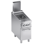 Cadru din otel inoxidabil. Butoane din plastic termorezistent cu margini serigrafiate utile. Incalzirea uleiului realizata prin combustie optimizata cu focuri din otel inoxidabil echipate cu schimbator de caldura in rezervor. Interventie puternica si rapida a elementelor de incalzire pentru a preveni scaderea temperaturii la turnarea produsului in rezervor. Un rezervor de 22 litri, echipat cu supapa de siguranta pentru gaz controlata de o placa electronica cu termocuplu clasa J, care permite reglarea temperaturii pana la 190°C. Siguranta garantata de un termocuplu mentinut activ de flacara arzatorului pilot. Indicatie pe afisaj a interventiei termostatului de siguranta. Ciclul de masurare asigura controlul electronic al incalzirii uleiului la intervale programate atat in faza de incalzire a uleiului (cand se utilizeaza grasime solida) cat si in faza de mentinere a temperaturii. Software care garanteaza atingerea exacta a temperaturii setate, evitand stresul termic al uleiului si oxidarea acestuia. Afisaj care arata temperatura uleiului din rezervor in timp real. Functie cronometru pentru alertarea utilizatorului cu un buzzer cand timpul de gatire presetat este atins. Rezervor din otel inoxidabil cu margini rotunjite in panta spre orificiul de scurgere conectat la un recipient din otel inoxidabil pentru colectarea uleiului. Scurgerea uleiului din rezervor prin robinet intr-un recipient de colectare intern cu filtru. Livrat standard cu un cos de otel acoperit cu strat de material protector K26500 si un capac pentru bazin din otel inoxidabil K4COPFGP. Livrat standard cu un recipient pentru ulei din otel inoxidabil cu filtru. Blat din otel inoxidabil AISI 304 turnat pentru curatare usoara. Capac frontal din otel inoxidabil AISI 304. Rezervor din otel inoxidabil format la rece. Finisaj blat taiat cu laser pentru potrivire etans si fixare prin legare. Testat cu gaz natural sau GPL, conform necesitatilor utilizatorului. Picioare reglabile pe inaltime din otel inoxidabil. Accesorii disponibile la cerere.