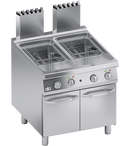 Cadru din otel inoxidabil. Butoane din plastic termorezistent atermic cu margini serigrafiate utile. Incalzirea uleiului realizata prin combustie optimizata cu focuri din otel inoxidabil echipate cu schimbator de caldura in rezervor. Interventie puternica si rapida a elementelor de incalzire pentru a preveni scaderea temperaturii cand produsul este turnat in rezervor. Doua rezervoare de cate 22 litri fiecare, echipate cu supapa electromecanica pentru controlul gazului si termostat electric de lucru cu reglare intre 90°C si 190°C. Siguranta garantata de un termocuplu mentinut activ de flacara arzatorului pilot. Termostat de siguranta suplimentar. Rezervoare din otel inoxidabil cu margini rotunjite inclinate spre orificiul de scurgere conectat la un recipient din otel inoxidabil pentru colectarea uleiului. Scurgerea uleiului din rezervor prin robinet intr-un recipient intern de colectare cu filtru. Livrat standard cu doua cosuri din otel acoperite cu strat de material protector K26500 si doua capace pentru bazin din otel inoxidabil K4COPFGP. Livrat standard cu un recipient pentru ulei din otel inoxidabil cu filtru. Blat din otel inoxidabil AISI 304 turnat pentru curatare usoara. Panou frontal din otel inoxidabil AISI 304. Rezervoare din otel inoxidabil formate la rece. Finisaj blat taiat cu laser pentru imbinare cap la cap si fixare prin legare. Testat cu gaz natural sau GPL, conform necesitatilor utilizatorului. Picioare reglabile pe inaltime din otel inoxidabil. Accesorii disponibile la cerere.