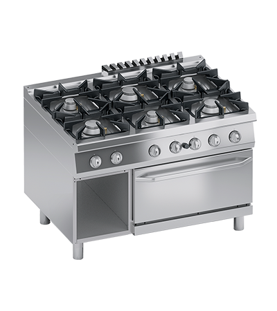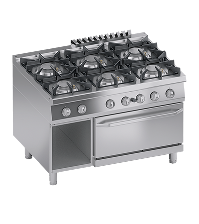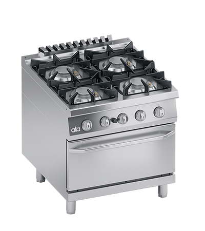 Cadru din otel inoxidabil. Butoane din plastic termorezistent cu margini serigrafiate. Usa dublu captusita si maner pentru utilizare intensa. Incalzire obtinuta prin focuri cu flacara stabilizata cu coroana simpla, etanse, de 8...