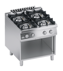 Cadru din otel inoxidabil. Butoane din plastic termorezistent atermic cu margini serigrafiate utile. Incalzire obtinuta prin focuri etanse cu flacara stabilizata cu coroana simpla (8 kW fiecare). Fiecare arzator este prevazut cu robinet de gaz de siguranta, care permite reglarea puterii de la maxim la minim. Siguranta asigurata printr-un termocuplu mentinut activ de flacara arzatorului. Gratare superioare din fonta acoperite cu material protector si focuri caracterizate prin corp din otel inoxidabil si capace arzator din alama nichelata. Gratare superioare asezate pe suprafete turnate cu margini rotunjite si focuri etanse pentru curatare usoara. Blat turnat din otel inoxidabil AISI 304 cu margini rotunjite pentru curatare usoara. Panouri frontale, laterale si posterioare din otel inoxidabil. Finisaj blat taiat cu laser pentru imbinare etans si fixare prin prindere. Testat cu gaz natural sau GPL, in functie de necesitatile utilizatorului. Picioare reglabile pe inaltime din otel inoxidabil. Accesorii disponibile la cerere.
