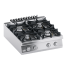 Cadru din otel inoxidabil. Butoane din plastic termorezistent atermic cu margini serigrafiate utile. Incalzire obtinuta prin focuri etanse cu flacara stabilizata cu coroana dubla, cu puteri diferite (6 kW si 10 kW). Fiecare arzator este prevazut cu un robinet de gaz de siguranta, care permite reglarea debitului de la maxim la minim. Siguranta asigurata printr-un termocuplu mentinut activ de flacara arzatorului. Gratare de suprafata si focuri fabricate din fonta emailata mata RAAF rezistenta la alcali, acizi si foc. Gratare de suprafata asezate pe suprafete turnate cu margini rotunjite si focuri etanse pentru curatare usoara. Scurgere blat prin preaplin disponibila la cerere pentru accelerarea operatiunilor de curatare. Blat turnat din otel inoxidabil AISI 304 cu margini rotunjite pentru curatare usoara. Panouri frontale, laterale si posterioare din otel inoxidabil. Finisaj blat taiat cu laser pentru potrivire etans si fixare prin legare. Testat cu gaz natural sau GPL, in functie de necesitatile utilizatorului. Accesorii disponibile la cerere.