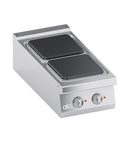 Cadru din otel inoxidabil. Butoane din plastic termorezistent atermic cu margini utile serigrafiate. Incalzire obtinuta prin plite electrice patrate din fonta. Elemente de incalzire fixate pe partea inferioara a plitei, incorporate intr-un strat de material izolant. Fiecare plita este prevazuta cu un selector care permite varierea puterii de incalzire de la maxim la minim in sapte pozitii. Siguranta asigurata printr-un limitator de temperatura situat in interiorul plitei. Suprafata de lucru din AISI 304 turnata cu grosime de 2 mm prezentand o adancitura pentru asezarea perfecta a plitelor electrice, curatare usoara si evitarea deteriorarii componentelor electrice de catre lichide. Panou frontal din otel inoxidabil AISI 304. Finisaj blat taiat cu laser pentru imbinare cap la cap si fixare prin prindere. Accesorii disponibile la cerere.