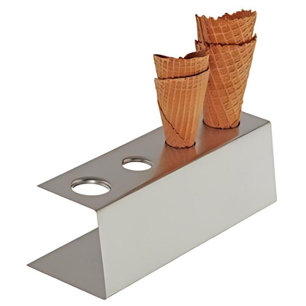 Suport din inox pentru cornete de inghetata, prevazut cu 4 orificii pentru sustinere stabila. Dimensiuni compacte: 27 cm lungime, 9,5 cm adancime si 9 cm inaltime.